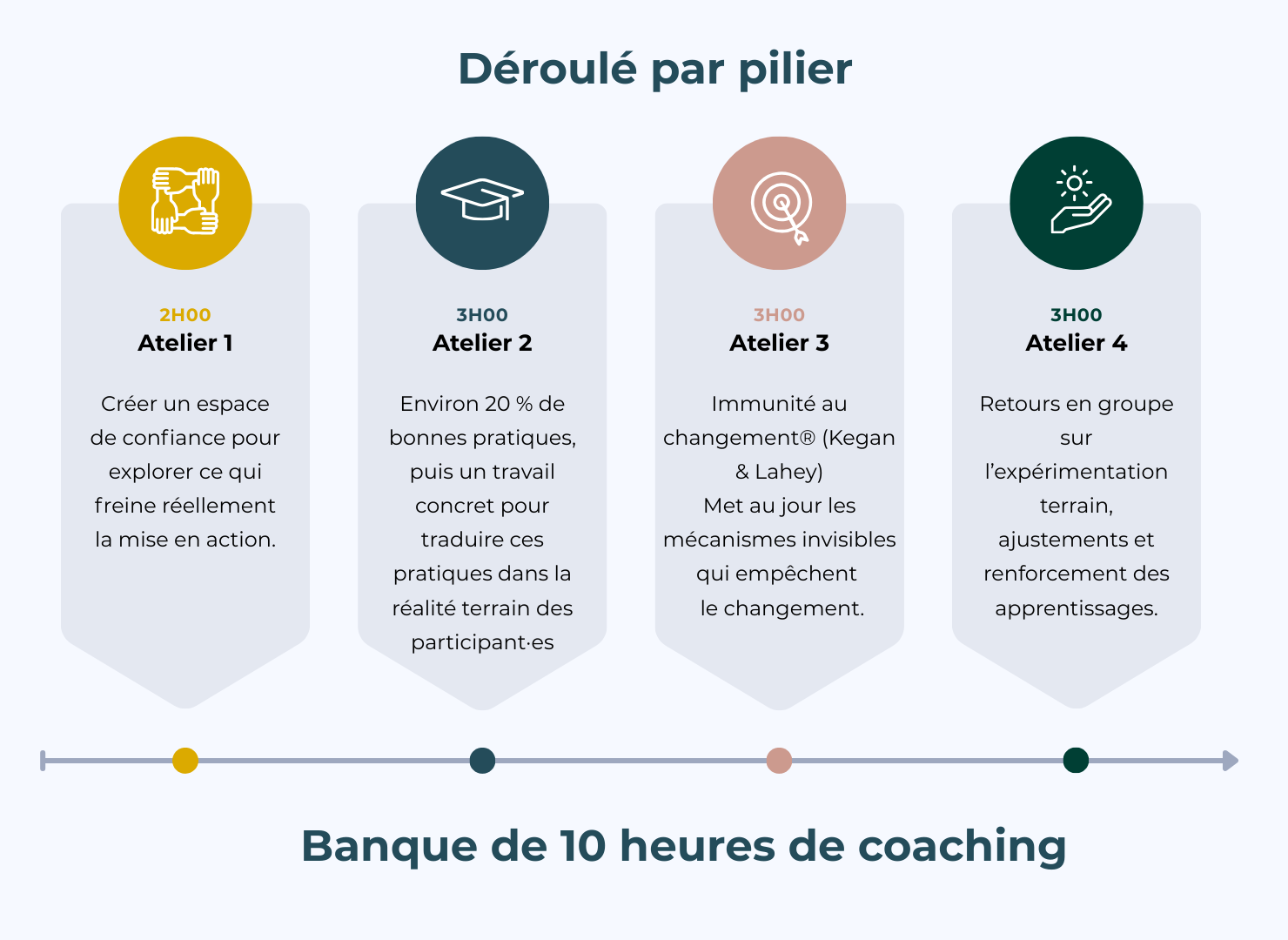 Quel que soit le pilier choisi, l’accompagnement repose toujours sur la même structure :